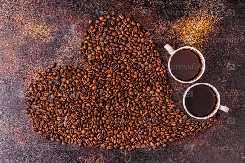 Чашка кофе и кофейных зерен в форме сердца