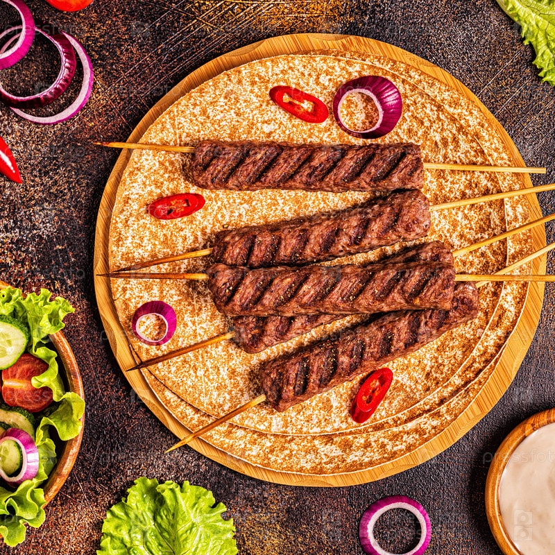 Традиционный ближневосточный, арабский или средиземноморский мясной шашлык с овощами и лавашем