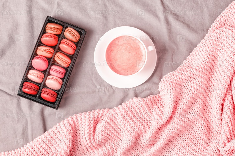 Кровать с розовым вязаным пледом, кофе и миндальным печеньем