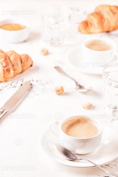 Традиционный завтрак со свежими круассанами на белом фоне