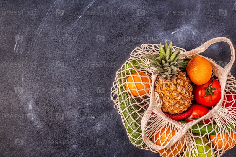 Свежие овощи и фрукты в сетке мешка