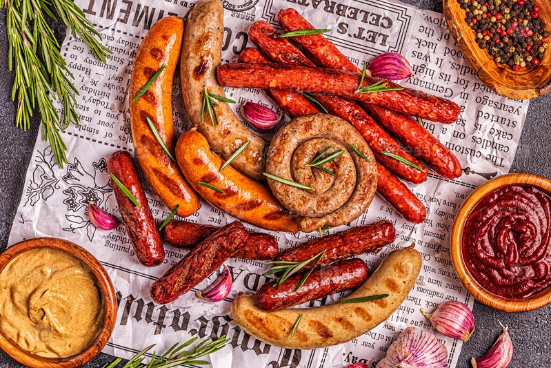 Домашние колбаски, приготовленные на гриле на газете