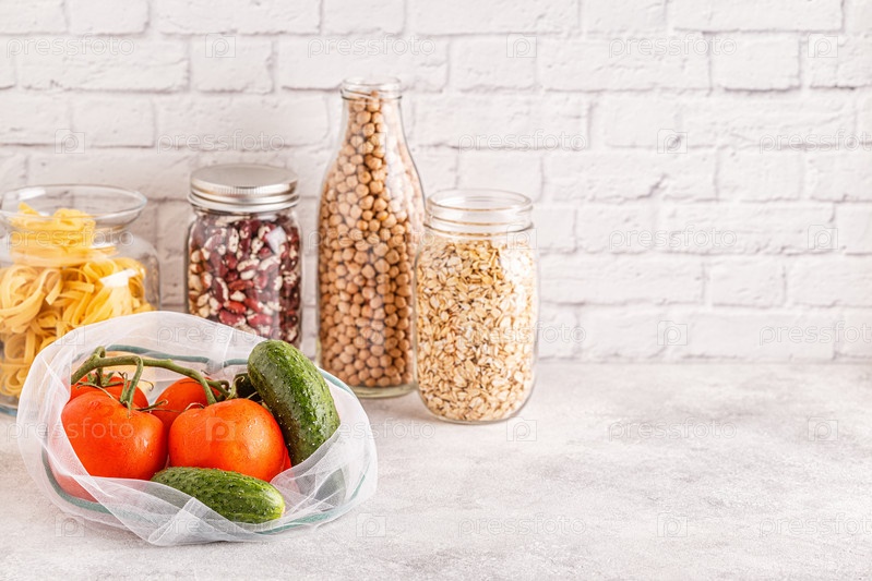 Изделия в тканевых мешках, стеклянная посуда. Экологичные покупки и хранение продуктов