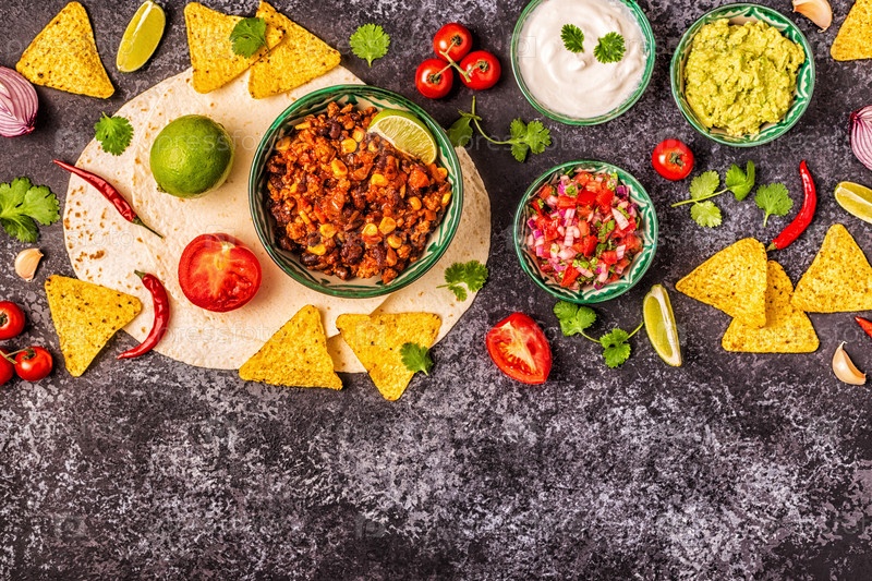 Концепция мексиканской кухни: лепешки, начос с гуакамоле, сальса