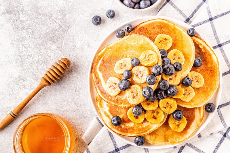 Блины с бананом, черникой на белой тарелке