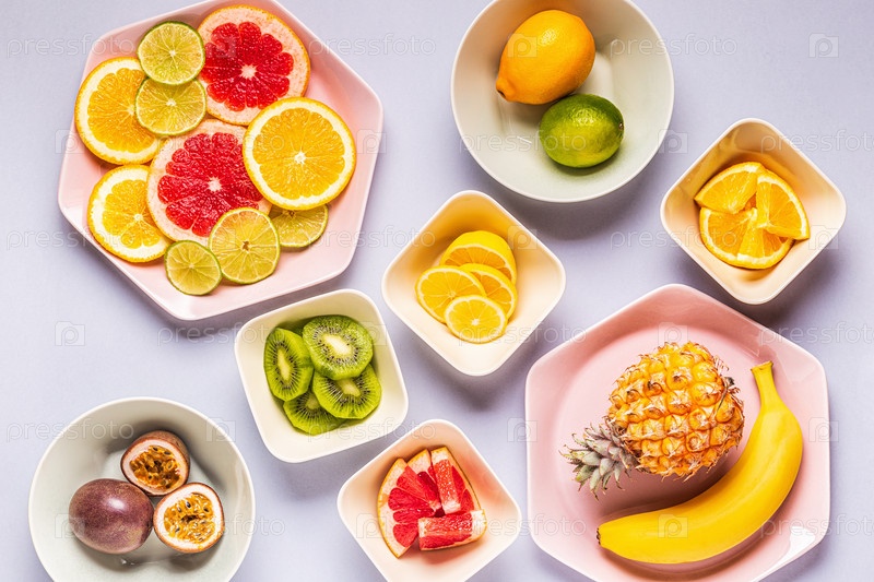 Тропические фрукты целиком и кусочки на тарелках