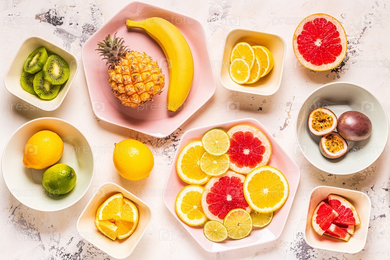 Тропические фрукты целиком и кусочки на тарелках
