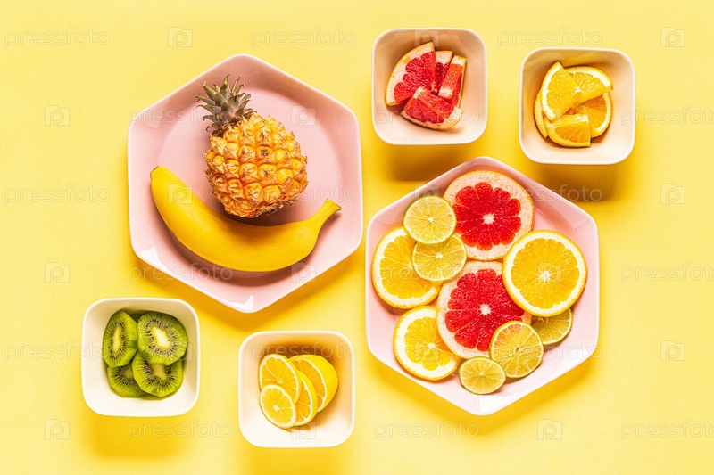 Тропические фрукты целиком и кусочки на тарелках