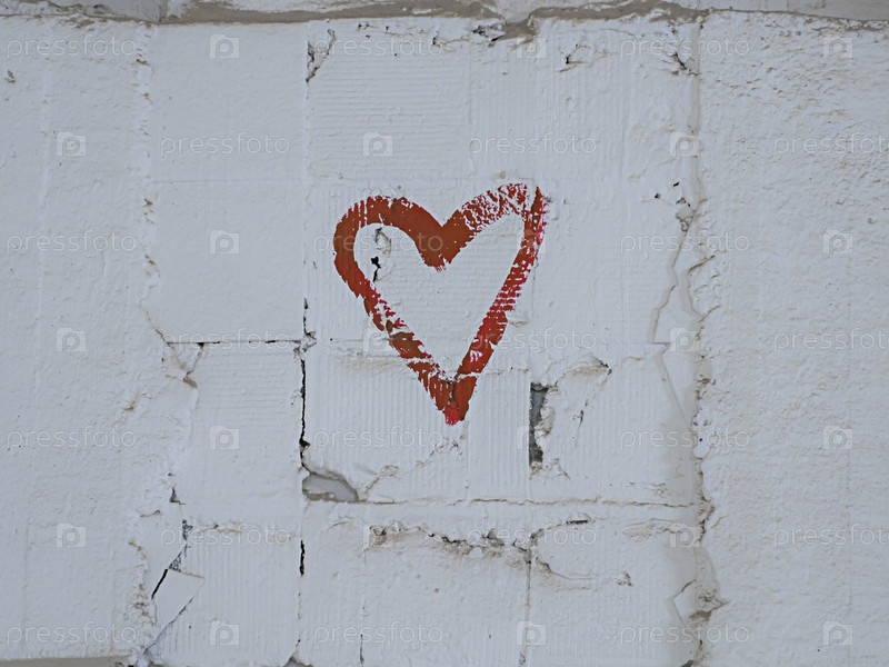 Рисунок красной краской в форме сердца на фоне белой кирпичной стены