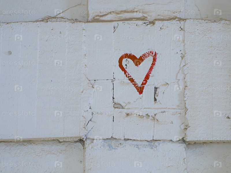 Рисунок красной краской в форме сердца на фоне белой кирпичной стены