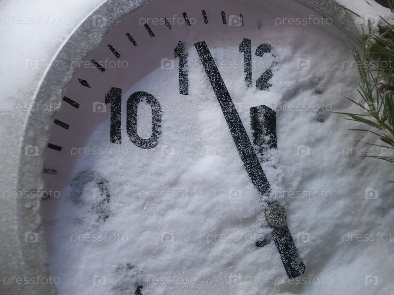 Стрелки часов приближаются к полуночи, обратный отсчет до Нового года, циферблат покрыт снегом