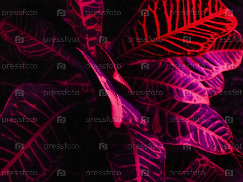 Выращивание листьев кротона под специальными искусственными светодиодными лампами с синим и красным спектром, благоприятными для растений с недостатком солнечного света