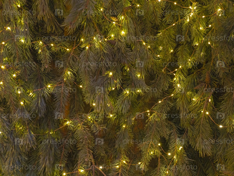 Стена из зеленых рождественских еловых веток с гирляндами, задний план