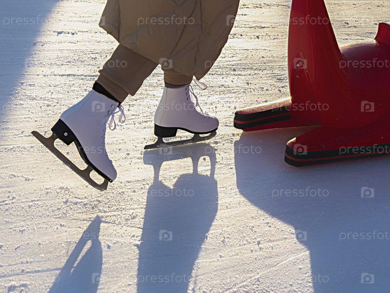 Девушка на катке с подставкой для катания на коньках. Поддержка при обучении катанию на коньках, девочка держит в руках вспомогательный инструмент или помощницу и учится кататься на коньках на открытом воздухе на катке. Зимние развлечения на свежем воздух