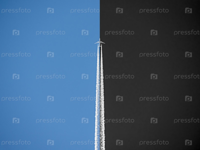 Самолет летит над белыми облаками и оставляет реактивный след на фоне, разделенном на черный и синий