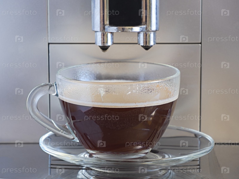 Кофемашина приготовила чашку кофе в стеклянной чашке и блюдце