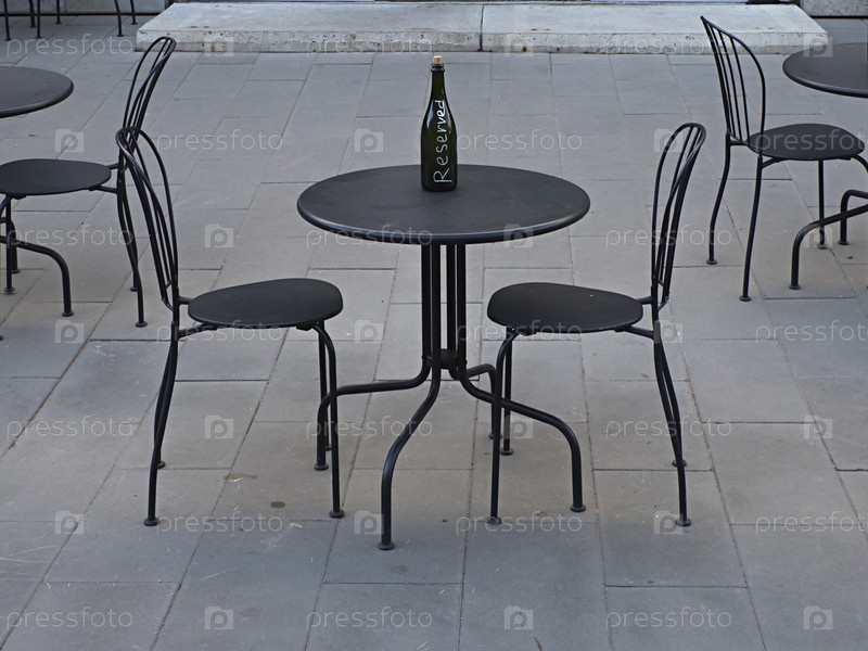 Металлический лофт черные металлические столы и стулья и пустая бутылка из-под игристого вина с надписью "зарезервировано" на открытой террасе кафе в индустриальном стиле