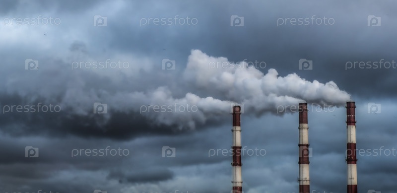 Три дымохода комбинированной теплоэнергетической установки ТЭЦ, заводской дым или перегар