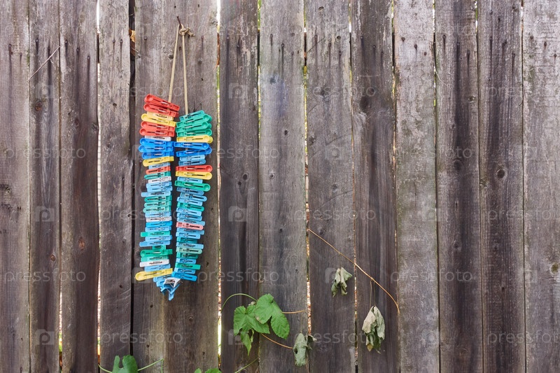 Куча прищепок висит на старом деревянном заборе. Листья дикого винограда растут из щелей в заборе