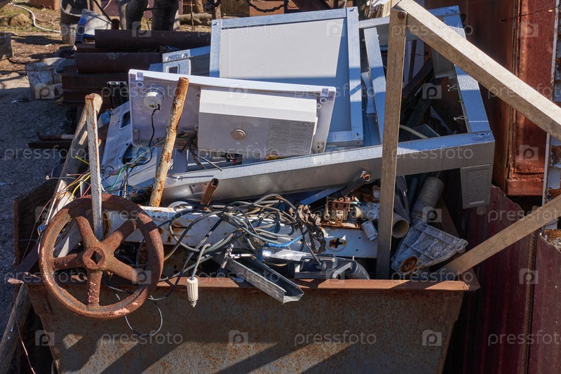 Куча ржавого металлолома от бытовой техники в ржавой корзине. Арматура, уголки, трубы и провода укладываются на переработку