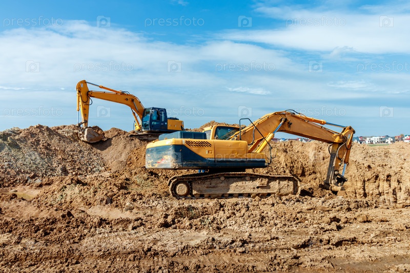 Два экскаватора копают почву на строительной площадке на фоне неба с белым пушистым облаком