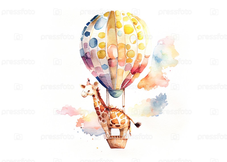 Жираф летит на воздушном шаре акварель