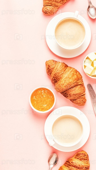 Кофе и круассаны на пастельном фоне
