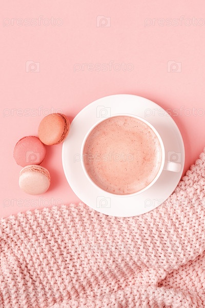 Фон с розовым пледом, кофе и миндальным печеньем