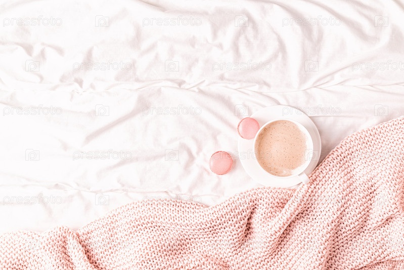 Кровать с розовым вязаным пледом, кофе и миндальным печеньем