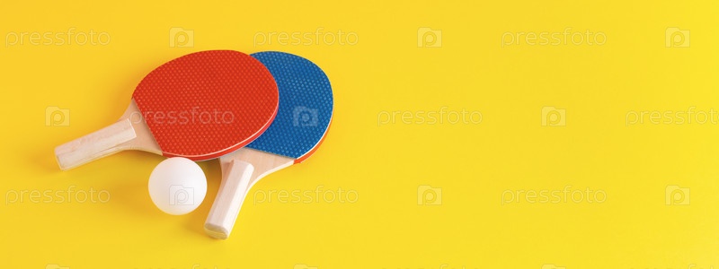 Оборудование для настольного тенниса на желтом фоне. Веб-баннер