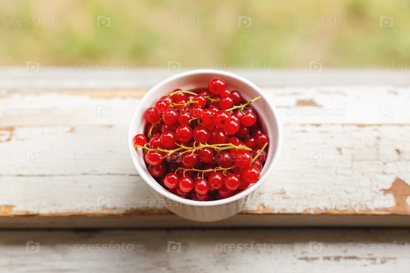 Красная смородина с веточками в белой миске на деревянном подоконнике