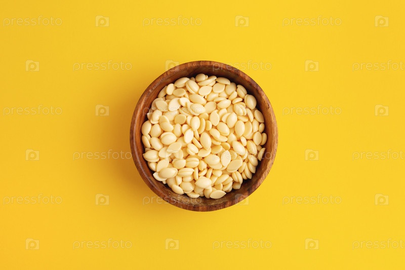 Гранулы воска пленки в деревянной миске на желтом фоне, вид сверху