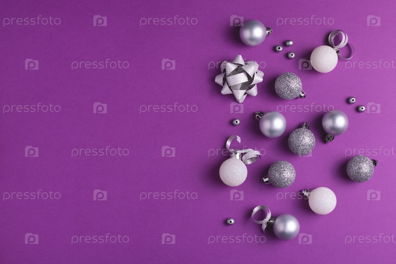 Рождественские украшения на фиолетовом фоне с копией пространства, вид сверху