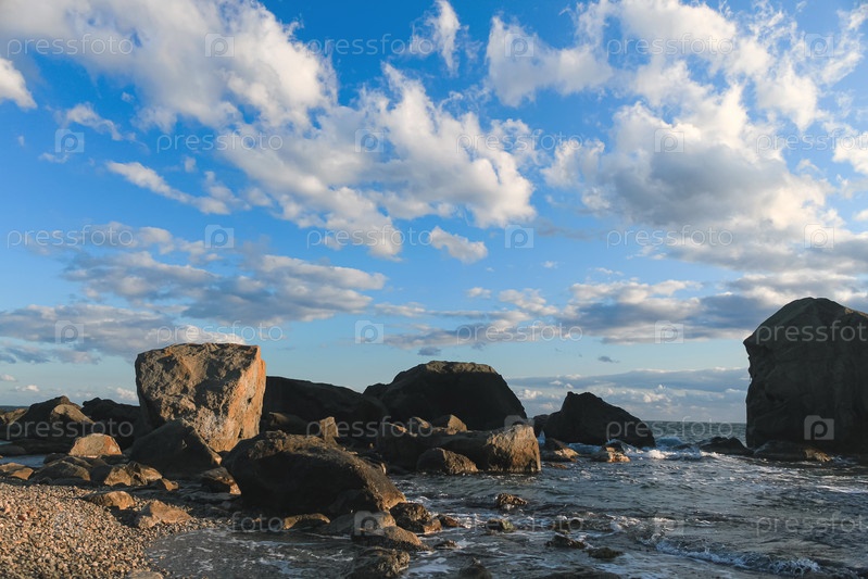 Летний морской пейзаж. Морской берег с галькой и большими камнями в воде. Голубое небо с белыми облаками на заднем плане