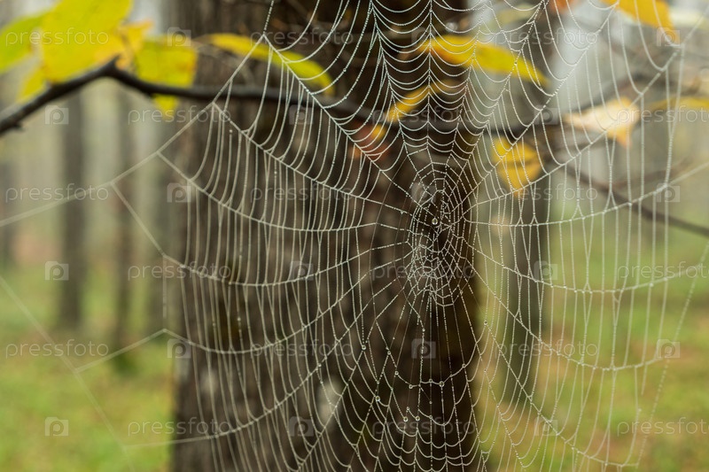 Крупный план паутины с каплями росы в осеннем лесу. Размытый фон. Выборочный фокус. Паутина в утреннем туманном лесу