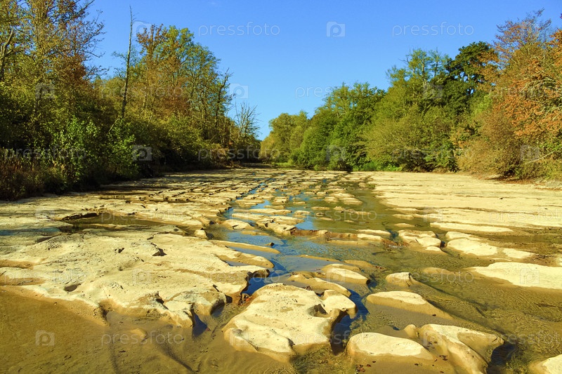 Пейзаж долины высохшей горной реки. Скалистое русло реки с небольшими ручьями. Лес и голубое небо на заднем плане. Проблема высыхания рек