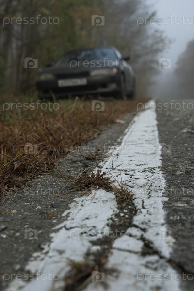 Треснутая белая сплошная линия на обочине асфальтовой дороги. На заднем плане на обочине дороги впереди стоит черная машина. Проселочная дорога в осеннем туманном лесу. Таинственный пейзаж