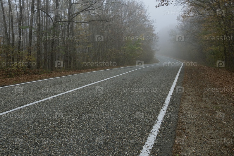 Кривая проселочной дороги с белыми линиями разметки в осеннем туманном лесу. Асфальтовая дорога и лес в тумане