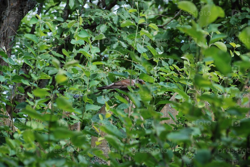 Полевая птица сидит среди побегов ирги
