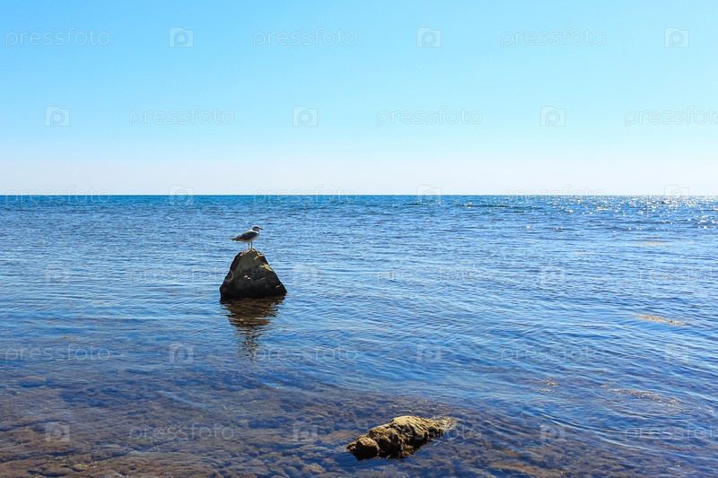 Чайка стоит на скале, возвышающейся над чистой голубой морской водой. На заднем плане горизонт и ясное голубое небо