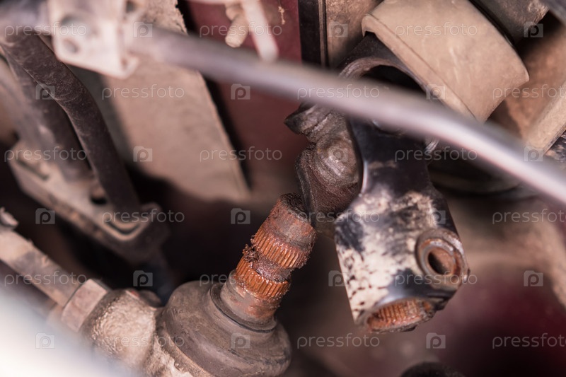 Крупный план ржавых шлицов и шарнира рулевого вала под капотом автомобиля. Ремонт и техническое обслуживание автомобилей