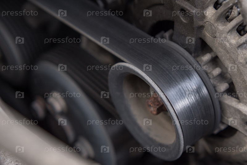 Крупный план приводного ремня и ролика генератора в двигателе автомобиля. Грязный мотор