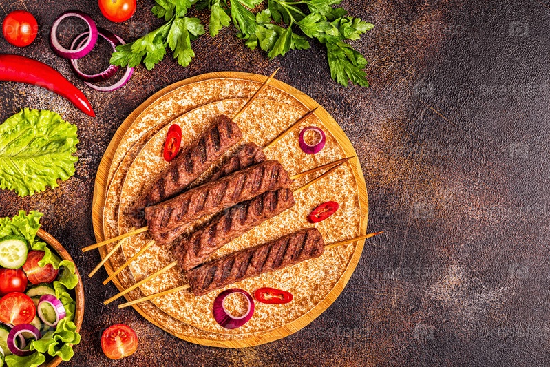 Традиционный ближневосточный, арабский или средиземноморский мясной шашлык с овощами и лавашем