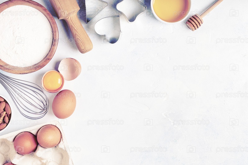 Ингредиенты для выпечки - мука, деревянная ложка, яйца