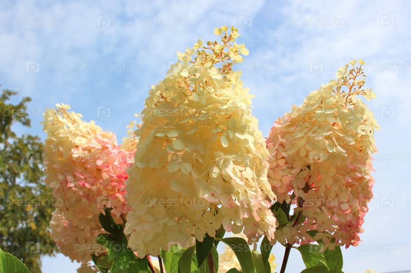 Цветы гортензии на фоне неба в сибирском саду