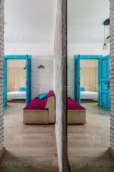 Интерьер квартиры в старинном стиле, с высокими потолками и старой деревянной дверью бирюзового цвета
