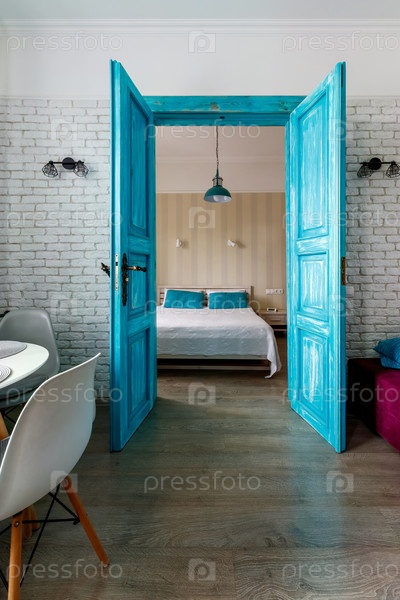 Интерьер квартиры в старинном стиле, с высокими потолками и старой деревянной дверью бирюзового цвета
