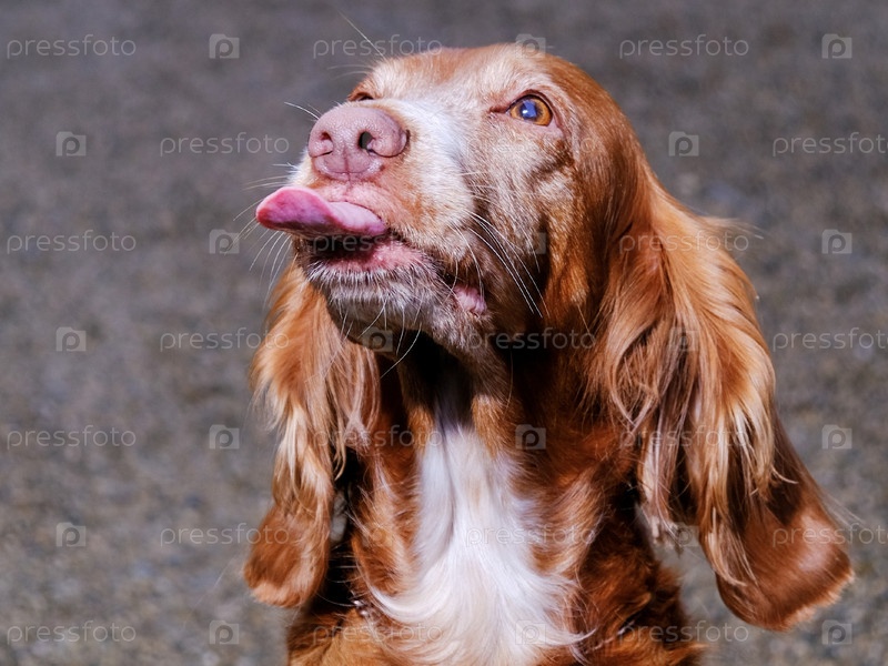Портрет русского рыжего спаниеля с высунутым языком на сером фоне