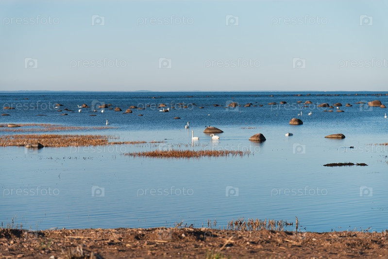 Лебеди в естественной среде обитания в Балтийском море весной