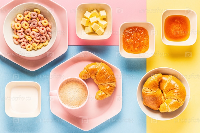 Кофе и круассаны на ярком модном фоне